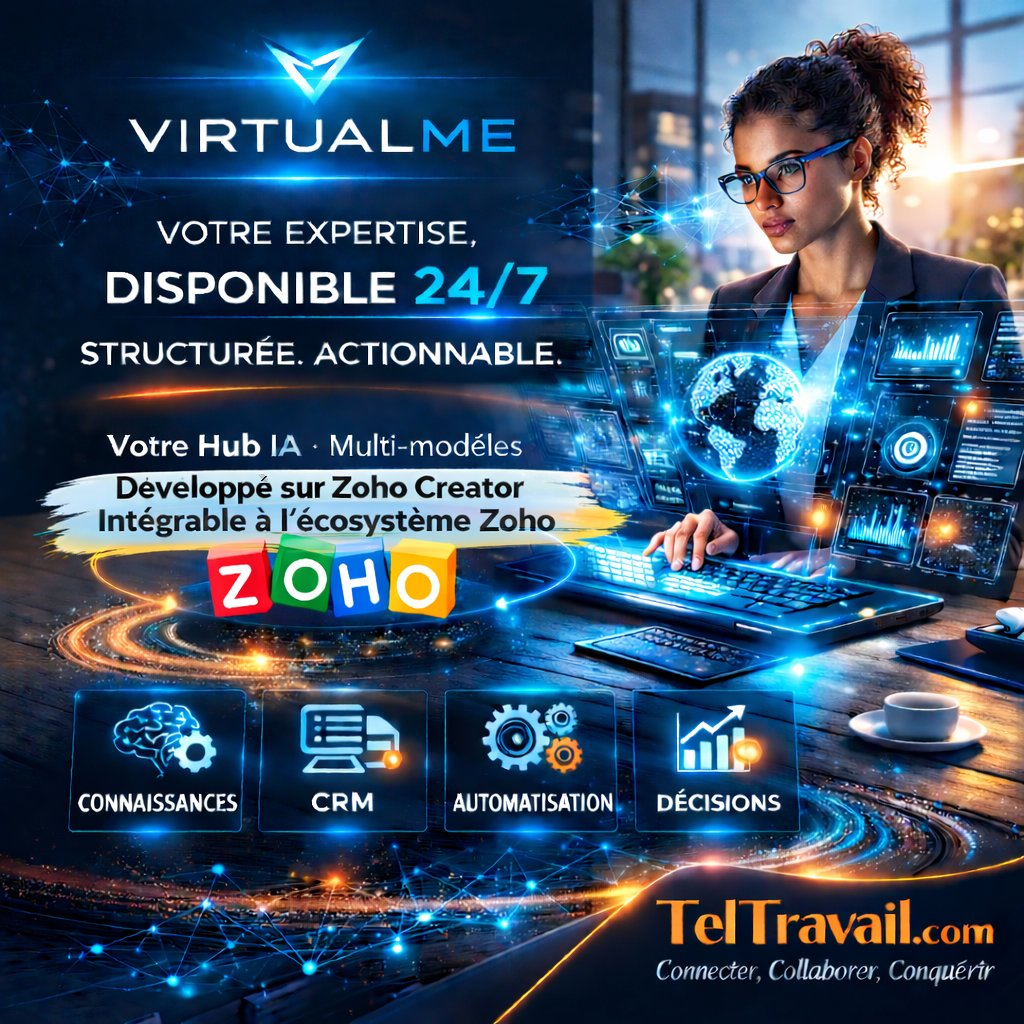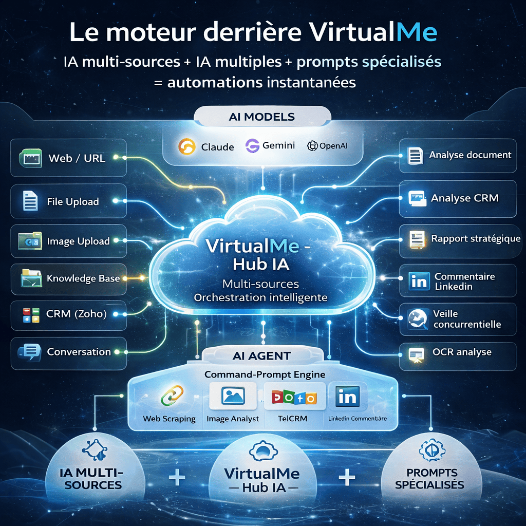 VirtualMe est une plateforme d’intelligence artificielle multi-agents conçue pour fonctionner autonome ou intégrée à votre écosystème Zoho.